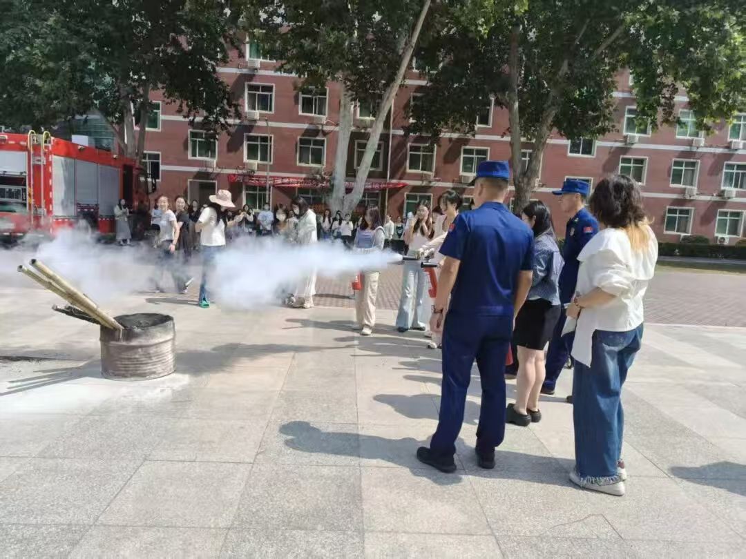 腾飞路消防救援站消防员给师生培训消防安全知识,消防员围绕河北省消防条例中安全责任、火灾预防等相关内容,进行了认真细致的讲解。接着河北大学安全工作处李昊辰老师详细讲解了灭火器“提、拔、握、压”四步操作要领,并强调面对火情要保持冷静、避免吸入有毒烟雾。随后,师生使用灭火器进行灭火实操演练,亲身体验灭火过程,进一步深化理论知识,提升了应急能力。