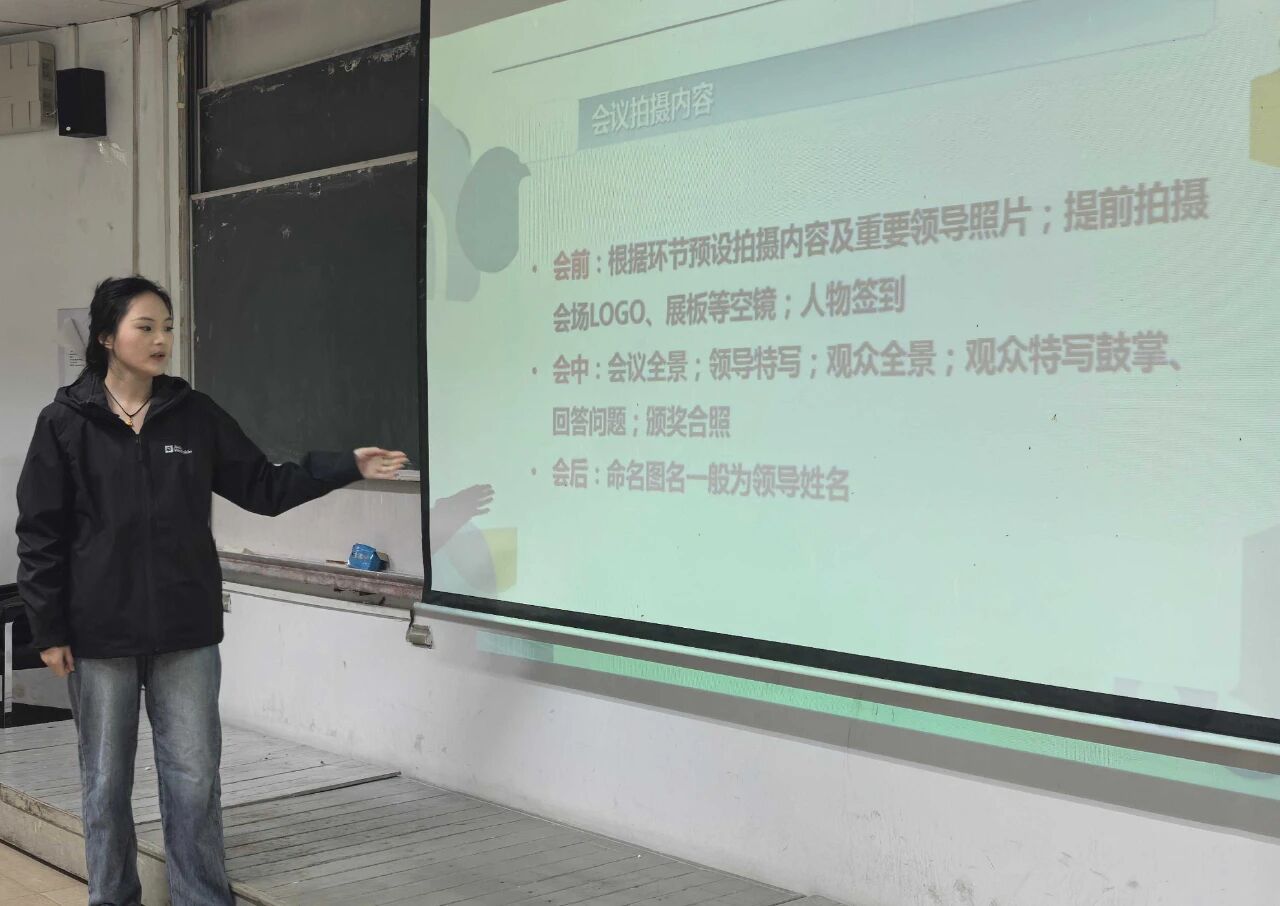 随后,孟烩琳同学针对室内光线不足和运动会等高速场景的拍摄难点,讲解了使用Tv档控制快门、开启连续对焦与高速连拍,以及提前对焦主体"必经点"等方法。她还拆解了重要会议的拍摄技巧,介绍了会前拍空镜与签到、会中抓全景与特写、会后规范命名图片的分阶段拍摄流程。