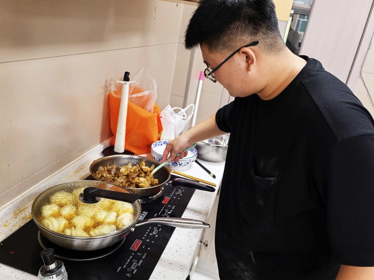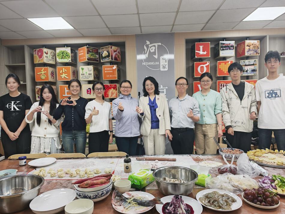 活动当天,师生一行清晨前往农贸市场,精心挑选各类新鲜食材,并有序分工,投入调料准备、蔬菜清洗、蛋液打制等前期工作。在随后的集体烹饪环节,师生携手包制饺子、共烹拿手菜肴,厨房内气氛热烈、笑语不断,全程流程紧凑、协作默契,展现出良好的团队配合意识。